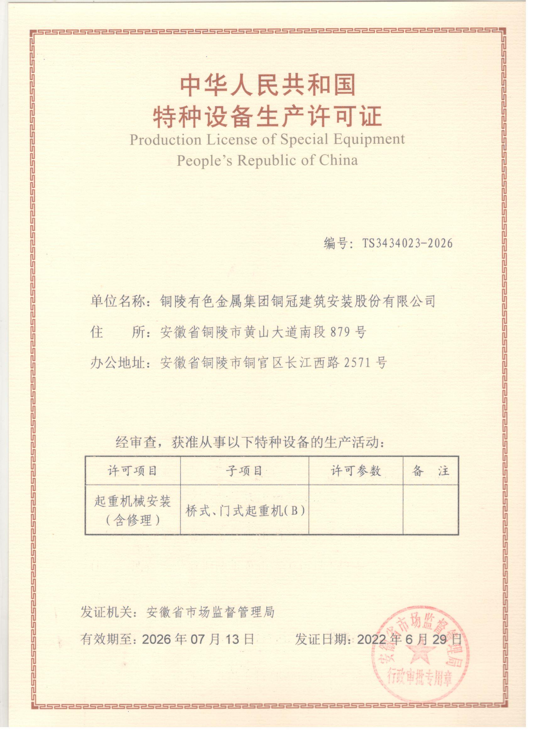 • 特種設(shè)備安裝改造修理許可證-起重機(jī)械